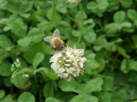道端にはクローバー(白詰草)が咲いていて、ミツバチが寄ってきて盛んに蜜を集めています。どこかにミツバチの巣があるのでしょう。