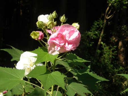 酔芙蓉の花で有名な、このお寺、やっと咲いている時期に見に行けました。白い花が今朝咲いた花で、ピンク色の花が昨