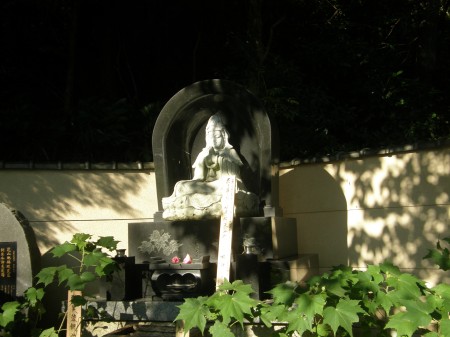 酔芙蓉観音様が酔芙蓉を見守るように見つめています。