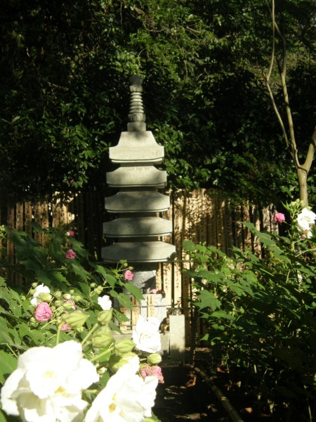 宝塔が酔芙蓉の奥にひっそりとたっています。