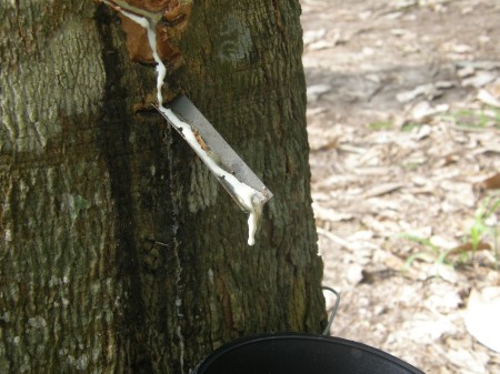 日本で言えば観光農園にあたりますが、昼間は傷を付けず朝早くに作業するそうですが、昼間に傷を付け、天然ゴムの採