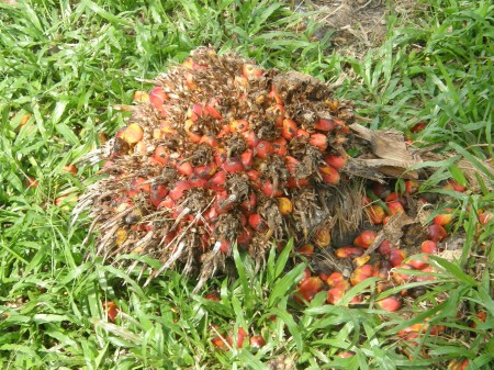 葉に隠れて付いているアブラヤシを上手く葉を切り落とし、そこに隠れてなっているアブラヤシをとって地面に落とした