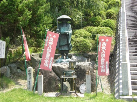 階段の右手にある弘法大師の像です。昔はきっとこんな姿で托鉢に回っていたのでしょう。周りの人が仏教に造形が深かったのでしょう。 |