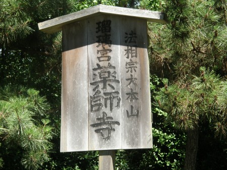 駐車場から薬師寺への案内でのたて看板、瑠璃宮・薬師寺です。なんとなくひなびた感じの看板だったので思わず撮ってしまいました。