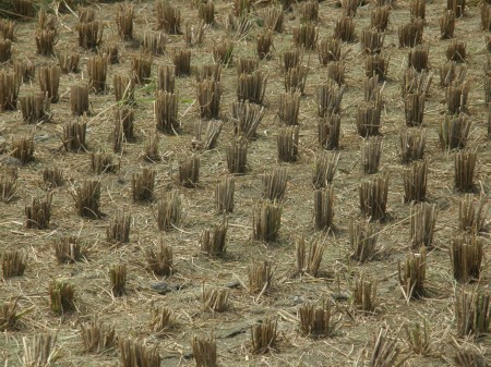 刈り取りの終わった田んぼ名 うちの庭の横の田んぼの稲刈りが終了したあとの稲の切り株だけの残った田んぼの風景です。しかし