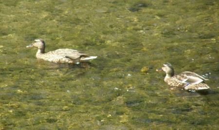コガモ まるで夫婦のように優雅に流れに沿って泳いでいます。